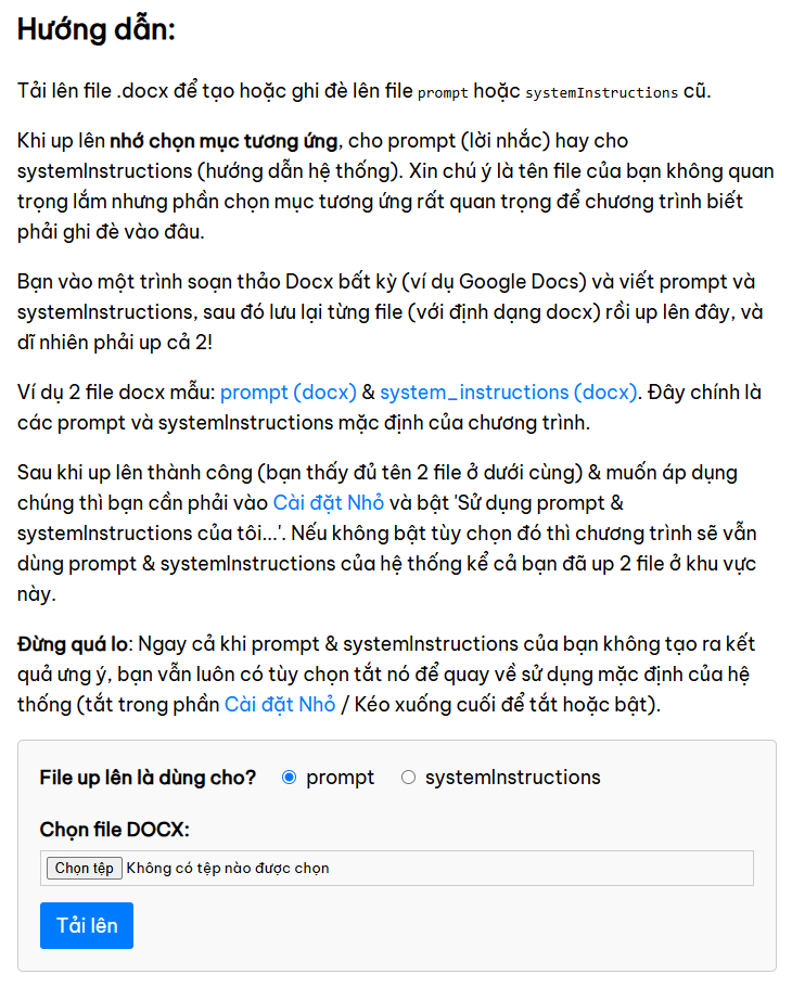 Bạn có thể dùng các ứng dụng như Google Docs để viết prompt và SI, sau đó tải nó về dưới định dạng docx. Cuối cùng up nó lên đây, tên file của bạn là gì không quan trọng nhưng nhớ chọn đúng ở phần File up lên là dùng cho? .