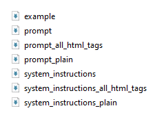 prompt.md&system_instructions.md: Cặp này là cặp mặc định khi dùng để dịch web, và là cặp quan trọng nhất.prompt_plain.md&system_instructions_plain.md: Cặp này dùng để dịch web ở kiểu dịch ‘chỉ dịch văn bản’.prompt_all_html_tags.md&system_instructions_all_html_tags.md: Cặp này rất hiếm khi dùng, là cặp dùng cho kiểu dịchGiữ lại toàn bộ thẻ HTML.- Ngoài ra là