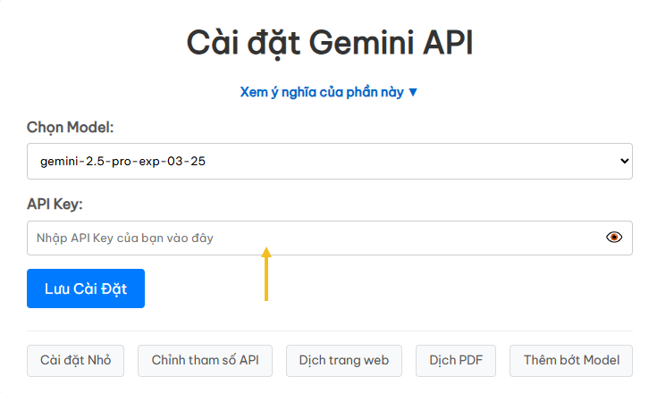 Sau khi nhấn vào Chọn Model, một cửa sổ hiện ra để bạn nhập Khóa API. Bạn copy – paste khóa vào rồi nhấn Lưu Cài Đặt. Bạn cần đăng ký Google AI Studio để lấy khóa này (lưu ý là dịch vụ này của Google có thu phí & thường cần thẻ VISA để thanh toán).